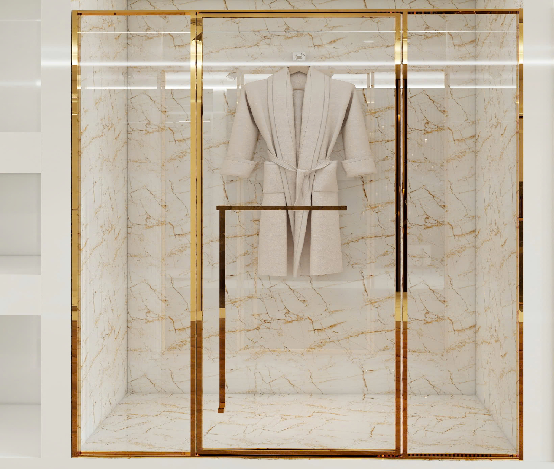 Từng vách kính được chế tác từ kính cường lực Hải Long đạt tiêu chuẩn an toàn cao, kết hợp với phụ kiện inox 304 mạ PVD bền bỉ và chống ăn mòn.